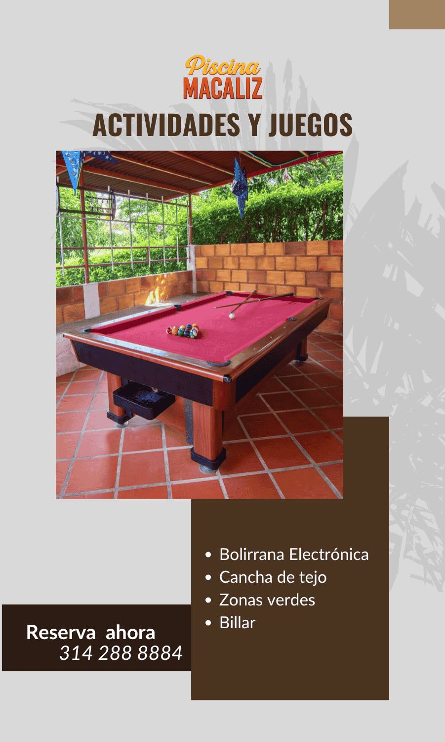 Disfruta momentos llenos de diversión en Hotel Piscina Macaliz con bolirrana electrónica, cancha de tejo y mesa de billar.