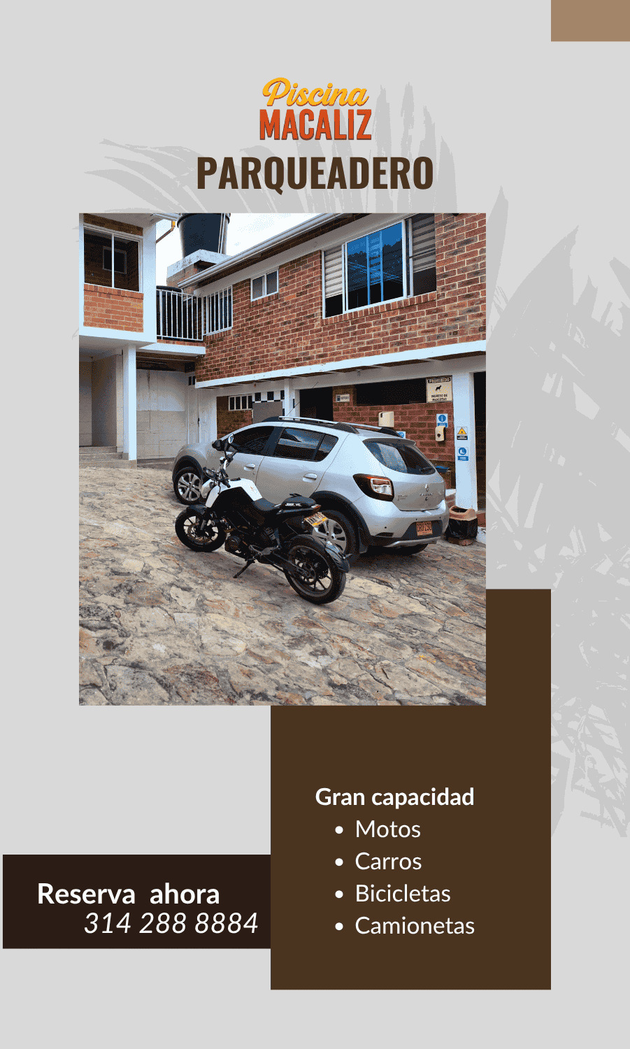 Contamos con una amplia zona de parqueo para carros y motos, con cámaras de seguridad y espacio suficiente para que tu vehículo esté siempre seguro.
